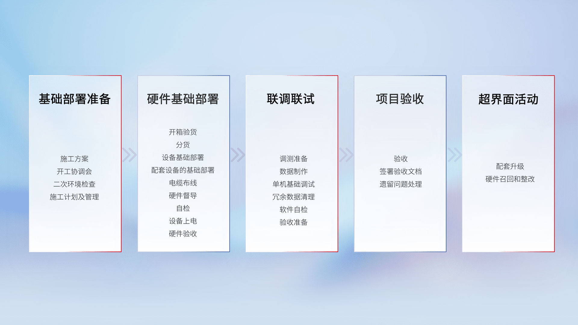 从基础部署准备、、、、硬件基础部署、、联调联试、、、项目验收、、越界面活动的全过程可追溯,,,,保证施工质量和进度。。。。